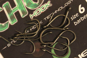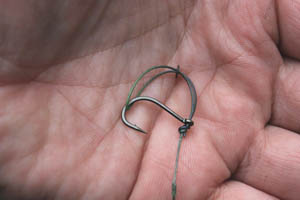 Take a Size 6 Covert “Chod” hook, these hooks are perfect for this type of rig, the Covert finish makes them less obvious on the lakes bottom. They also have a very sharp straight point which aid better penetration when you get a pickup when using popup rigs. It also has a slightly out turned eye which makes the 45 degree angle off the hook when this rig is tied up, giving it the perfect alignment for better hooking.