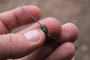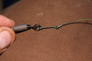 Attach the hook link via a loop to loop knot to the ring swivel. This will make it easy if you have to change hook link colour, breaking strain or even if it gets damaged. Attaching it to this ring will give the rig a lot more movement and aid in a tangle free cast.