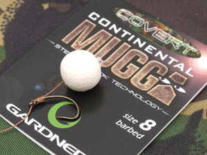 Step 4 – Secure the pop-up to a size 8 Covert Continental Mugga using a knotless-knot. Ensure that the pop up is positioned at the start of the bend.