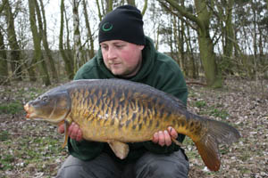 The next morning was a frosty one but the skies were clear and it wouldn’t be long before the sun’s rays hit the water by the island. Watching the water I saw no signs of fish anywhere but as I scoffed my bowl of porridge I reckoned it wouldn’t be long. I was happy with my presentation on all three rods, my lines were slack and I had no intension of recasting any of them and risk disturbing the swim. It got to about eleven o’clock and a fish boshed twenty yards past my middle rod, five minutes later the rod was away and a very angry carp exploded on the surface making all the coots run for cover. The fish was tamed fairly quickly after it’s little outburst and it was soon resting in my net waiting for a quick weigh and some pictures. I had a quick nosey before I got all my camera gear ready and I was shocked at it’s scale pattern to be honest, it was a stunning linear, not huge but it didn’t matter.