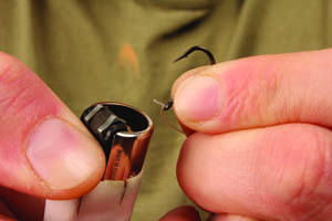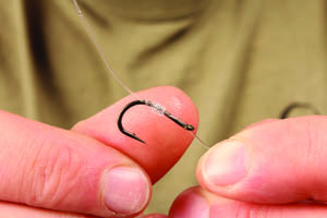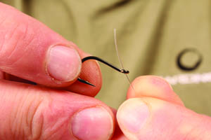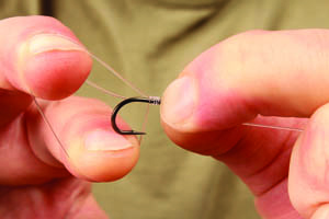 Step 4. When tightening the knot fully stop the hook link being marked by the eye by drawing the knot tight over the end of your thumb.
