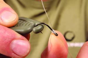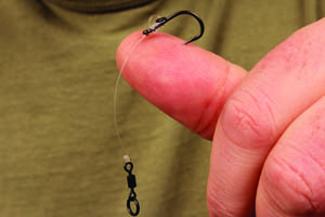 Step 5. thread on a small Covert rig ring and pass the tag end back through the eye of the hook.