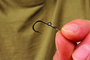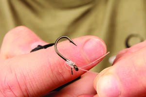 Step 1. Start off by threading the Trip Wire through the eye of a Chod Hook this way.