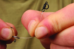 Step 8. If your tying up a choddy use a simple 3 turn blood knot with the tag blobbed to attach a size 12 Covert Flexi-Ring Swivel.