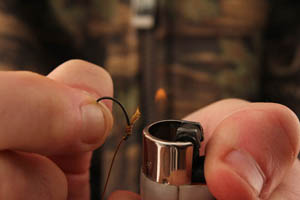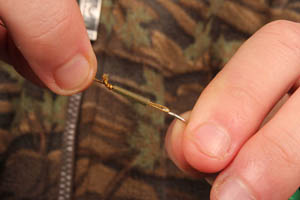 Step 5. Test it’s lined up correctly by gently drawing the hooklink over your finger. The hook should flip over like this every time when its right.