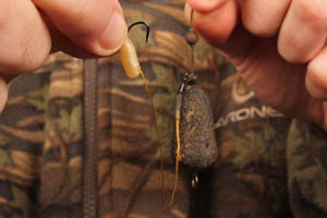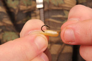 Step 8. All thats left to do is hook on a few maggots and tie a micromesh PVA bag of maggots onto the flexi ring below the lead.