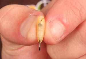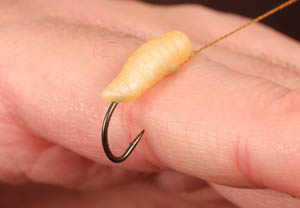 Tightly woven Gardner Micromesh PVA is absolutely essential when tying up PVA bags of maggots, so they do not wriggle through the holes and escape. The PVA bag is sealed by wrapping Fishnet PVA Tape around the swivel on the lead which is held in place with a couple of overhand knots. If you tie a tightly compressed bag of maggots to the lead and you can nick the hookbait onto the PVA (being careful not to puncture any of the maggots inside) and this effectively stops any tangles and ensures the hookbait is surrounded by a visual and highly attractive patch of freebies.