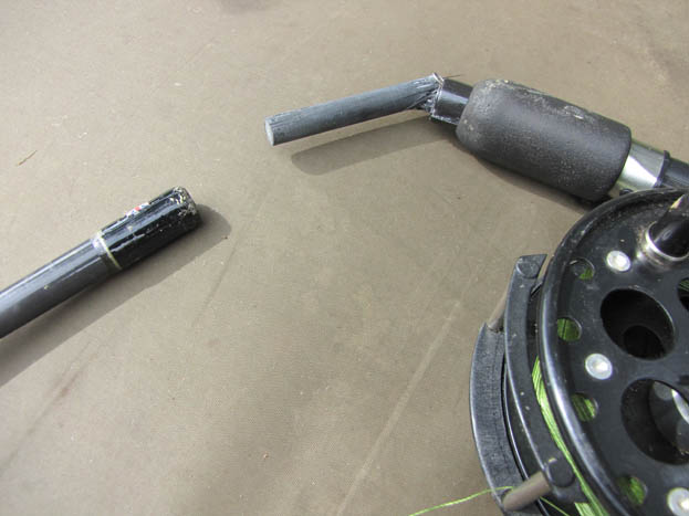 Just as I was watching him diving in and out of the water, my rod was wrenched round and almost pulled from my grip. If I hadn’t been holding it at the time, I think the rod butt probably would have hit me in the chin the take was so violent. I clamped down on the centrepin and tried to stop the fish bolting downstream, instantly realising I was attached to something rather large. I was just starting to think I had maybe hooked one of the rogue carp that reside along this stretch, when BANG, the rod snapped. No warning at all, it just snapped clean off about 3” above the reel seat!! Now I was in a pickle, on one end of the line, was a large fish trying to head downstream, and on the other was me holding a reel and rod butt, with a stupid surprised look on my face. I couldn’t even hold the rest of the rod and use that, as it had javelined down the line and was now languishing in mid-air over the river.