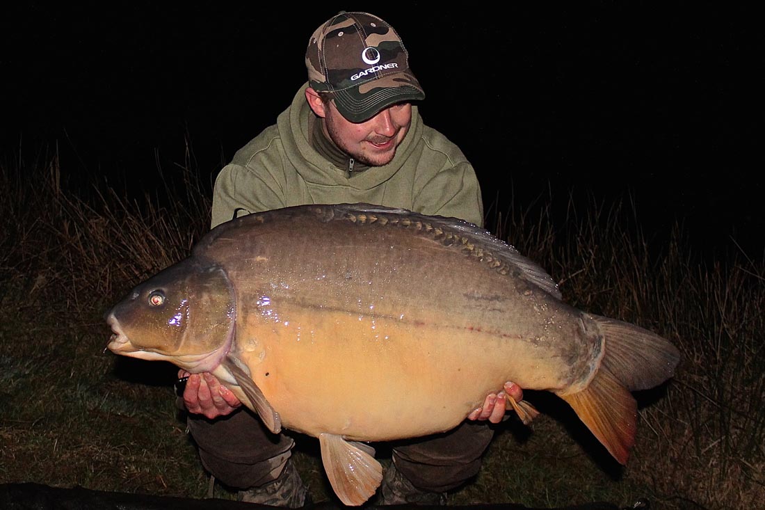 The weather turned cold and I honestly thought I was going to blank on my first 48 hour session of the year. As darkness fell on the first night, I hadn’t had seen even a glimpse of life in the water let alone a carp. While fast asleep at 12.30am the right hand rod was away and I was into a powerful carp. After a lengthy fight I slipped the net under a chunky mirror know as The Parrot. I previously caught this fish weighing 37lb two years ago, so I was delighted to see it tip the scales at 43lb 1oz. I was over the moon considering the weather and I had now caught the lakes three biggest fish (all over 40lb), which made things a tad sweeter considering the difficulty of the venue.