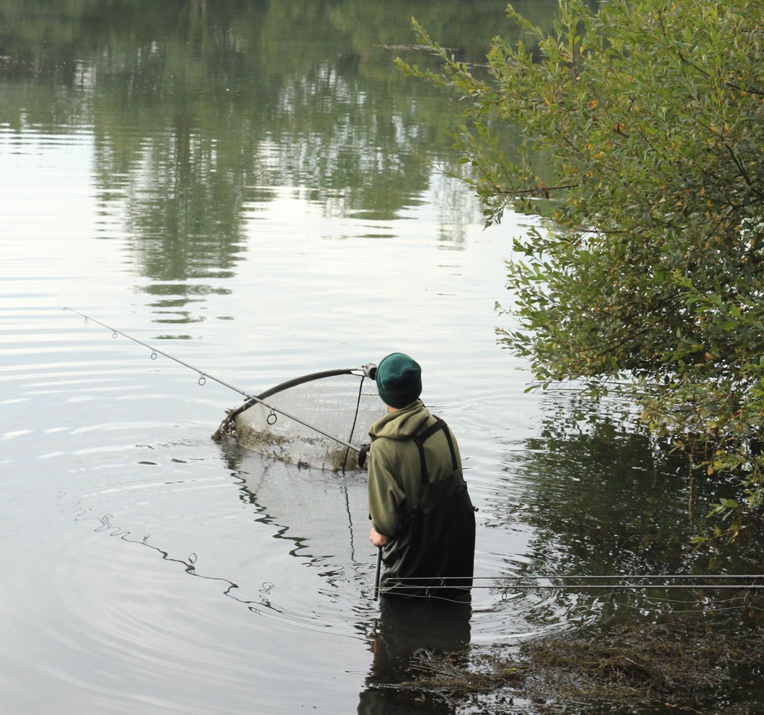 At 2:30 am I had a take from the right hand rod but unfortunately lost it in a thick weedbed. I was a bit gutted, but got the rod back out and headed back off to bed. I was woken at dawn by a nice steady take, one of those that you know a big fish is responsible for before you pick the rod up. The fish instantly flat rodded me and was almost unstoppable before it weeded me up. I kept steady pressure on it for a few minutes before it came free of the weed, only for it to go into another weedbed nearby. I kept steady pressure on the fish again and after 25 minutes I could feel the weed bed slowly breaking up. On the misty surface I slowly led a weedbed the size of my bivvy slowly back towards the bank. At this moment in time, I had no idea whether the fish was still on. As the weedbed got closer, I knew I wouldn’t be able to scoop the whole lot up in the net. With my waders on, I put the rod back on the rest and went in. As I broke away the weed from the leadcore, a big fish wallowed next to me and then shot off. I quickly grabbed the rod and my mate that I was doubled up with woke up to all the commotion. I slowly played the fish back in and within a few minutes the beast was safely in the net.