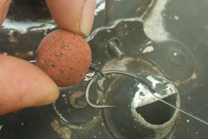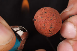 Step 8. An easy way of attaching the hookbait is to pull through a piece of monofilament and blob it with a lighter.