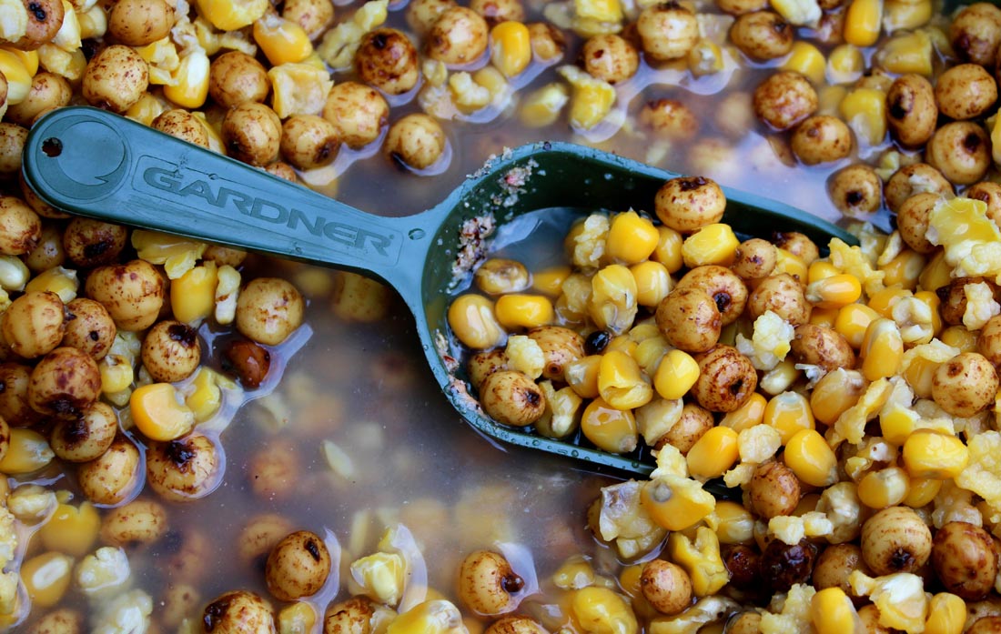 With my area sorted I set the Gardner Wrappers up and wrapped out 21 rod lengths on each rod to allow for the drop on a tight line. I put out around 20 large Spombs of mostly maize with some tigers and a few kilos of Mainline boilies. I had dosed this bait up with half a bottle of Mainline Condensed Coconut Milk Syrup and a good squirt of the Cell Liquid Match Additive. The syrups and liquid match additives are brilliant for enhancing all particles. There are lots of large roach and bream in the lake, so in order to keep them occupied and give the carp a chance to get in on the area a decent amount of bait is needed. I still like to catch the bream in amongst the carp, so I have an idea of how much bait is out there at any time.