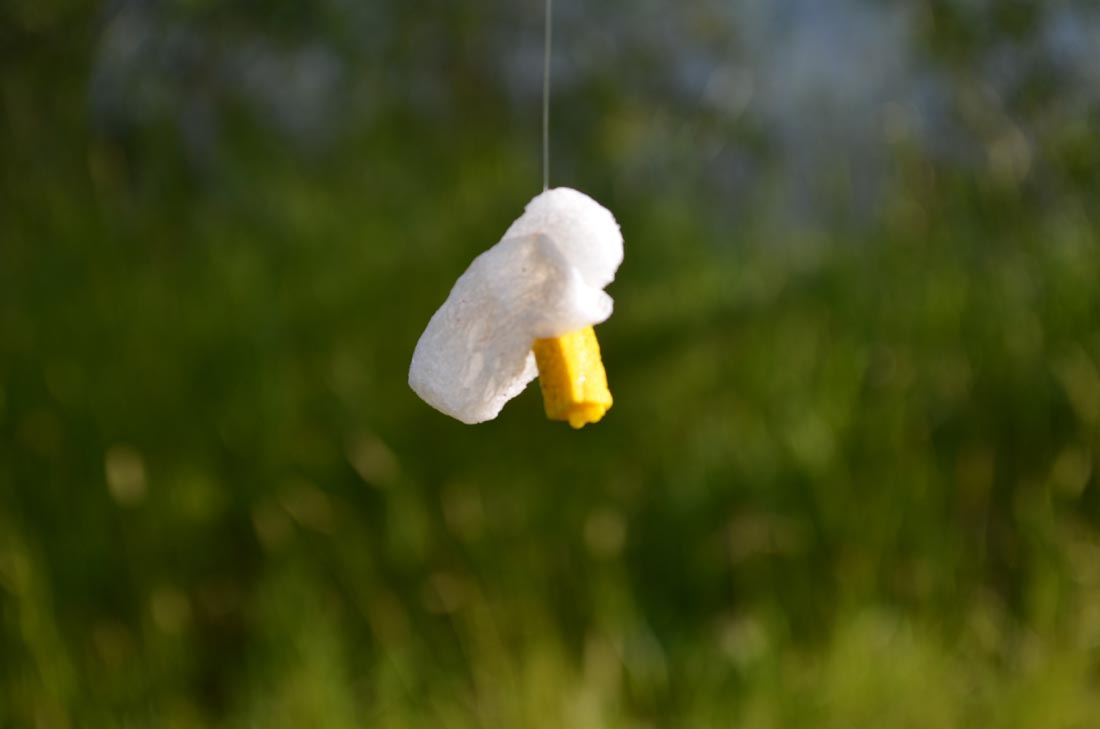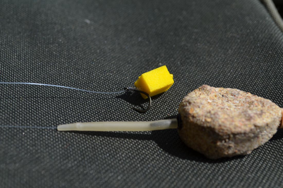 L’idée de l’utilisation de pain de mie broyé m’est alors venu après la vue d’une mamie jetant du pain aux canards. Le pain de mie broyé étant flottant, j’ai réalisé avec ce dernier de gros sticks que je coince au niveau du plomb avec mon anti-angle. Lors de la fonte du PVA, des morceaux de pain remonte à la surface créant ainsi une colonne vertical d’amorçage mais ce n’est pas tout! A l’agrainage, tu reviendras! Ayant une préférence pour les morceaux de mousse jaune pour mon zig rig, je me suis mis à agrainer du maïs doux sur mon montage. Et tout ce que je peux vous dire, dévastateur!
