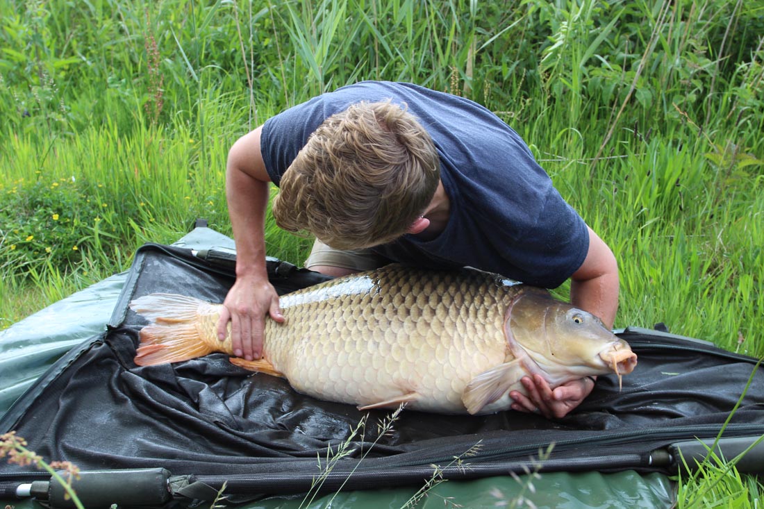 Once again I re-positioned my bait amongst the deep silt and within 15 minutes it was off. A powerful, slow moving fish kept me hanging on for what felt like an age! Finally, I managed to coax the long framed fish over the draw cord and I dropped to my knees with exhaustion and tiredness. As I pulled back the net to look at my prize my heart sunk. It was the big common, I couldn’t believe it!