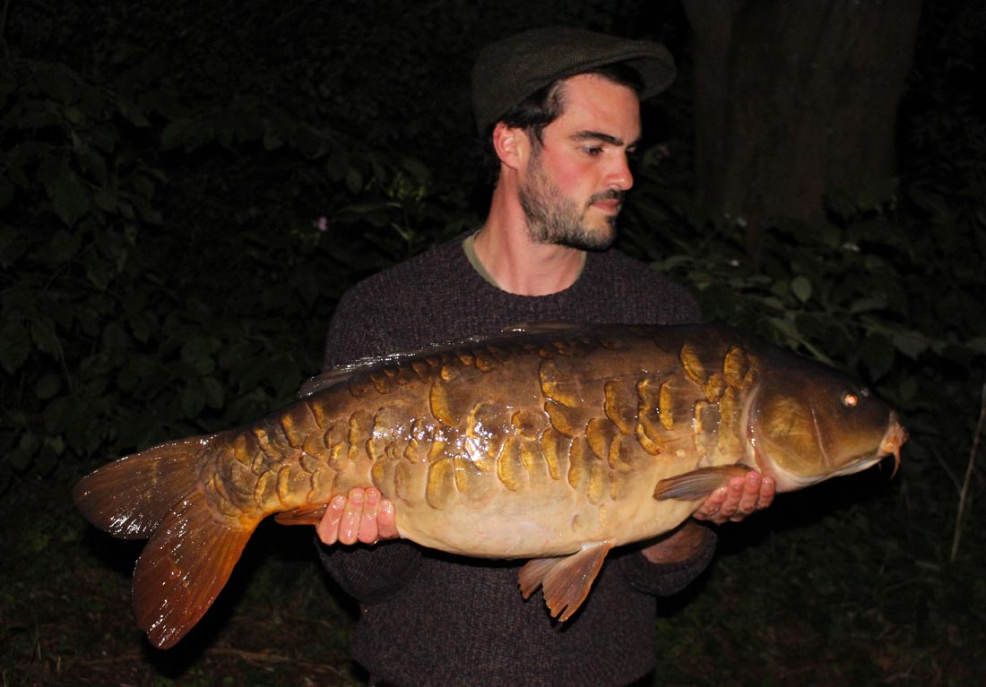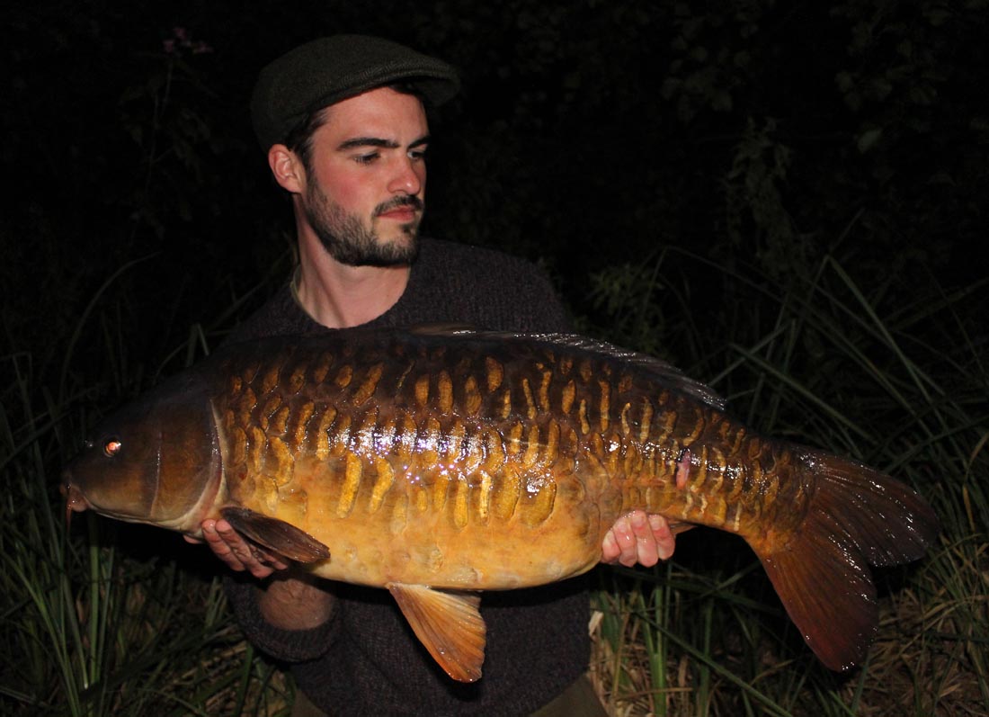 Over a couple of weeks of trying, my overnighters had proved fairly fruitless, at least until I dropped into a swim called ‘Fairy’ late in September. I couldn’t help but feel confident with the amount of shows that evening and I stayed up late drinking coffees and listing to the deep slurps out in front. Just as I was drifting off a short, rapid series of bleeps had me bolt upright. I sat by my rod just as the tip went over. We were in business! After a rather uneventful fight I had a lovely heavily scaled mirror in the net. A friendly chap called Julian helped with the pictures and I quickly fired a bait back out to the mark.