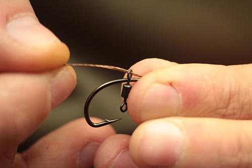 Step 2. Double over the hooklink and thread it through the hook eye and then add a Target Rig Swivel.