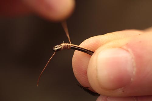 Step 5. Using the hooklink section over whip a long knotless knot (approx 21 turns).