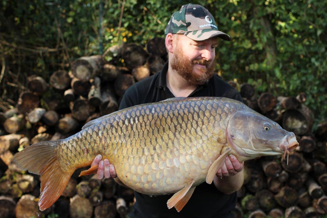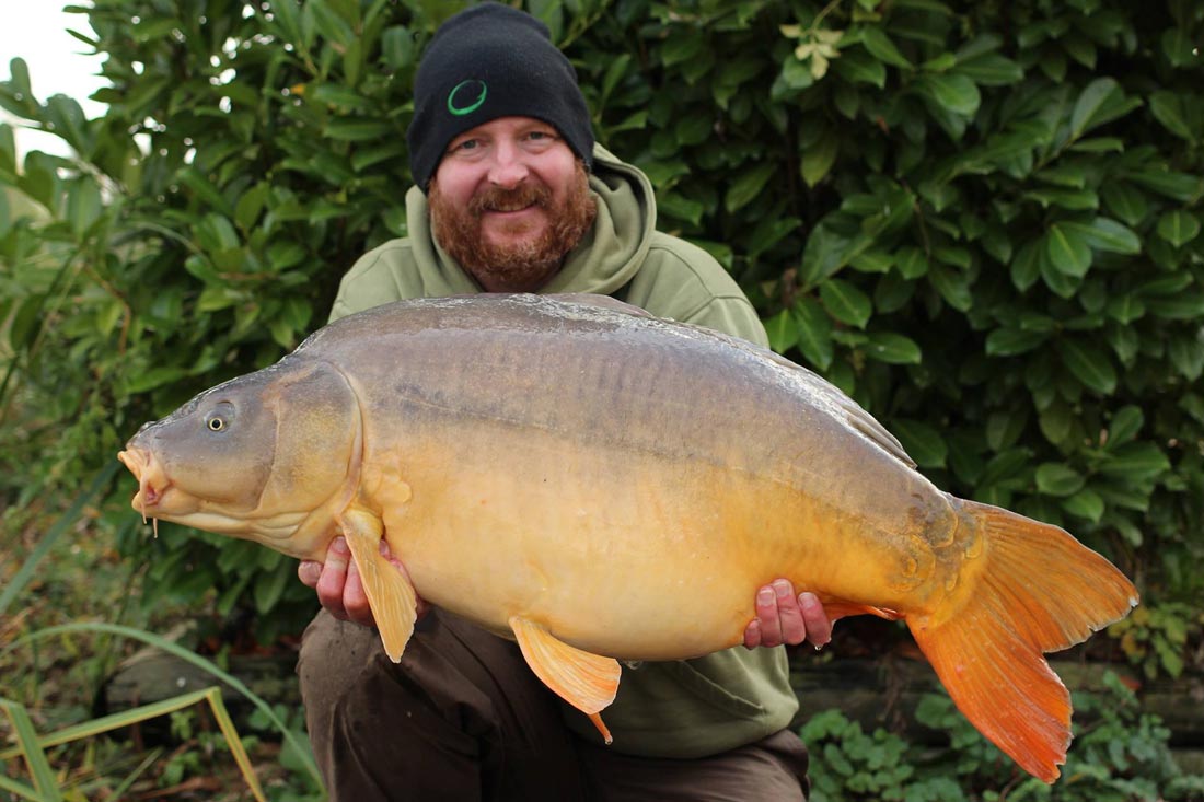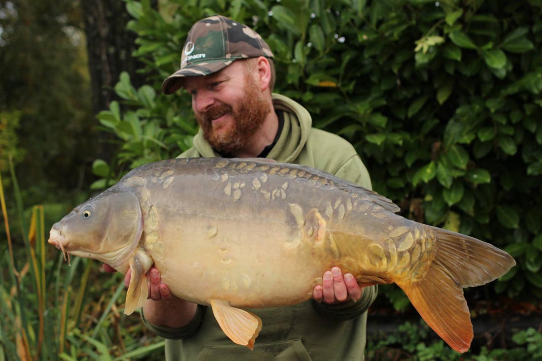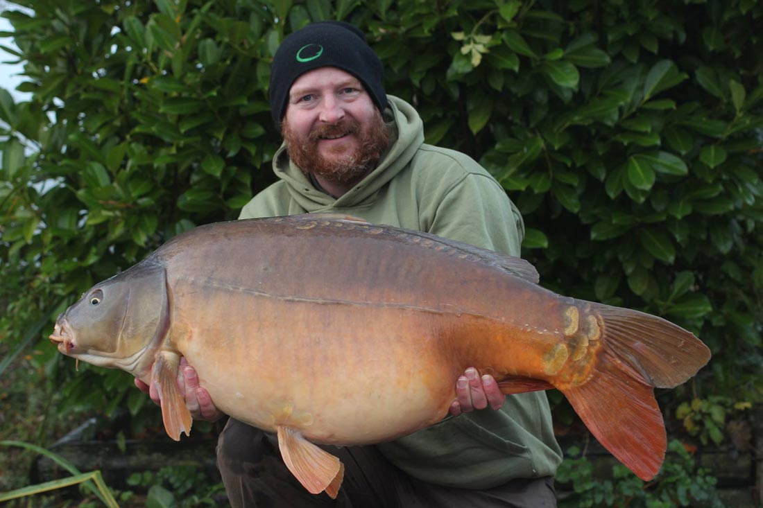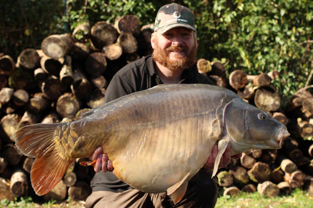 I went back out in the boat for a quick prod around with a stick and soon found the spot I had had all my previous fish from. It was only about 20 foot from the bank in about 10 feet of water. In an area of relatively firm silt, there was a hard clay spot about 5 feet in diameter. The rig was lowered back onto it and after a couple of scoops of my bait mix were sprinkled over the top, I rowed back to my swim. I’d probably only been back on the bank 30 minutes, when the middle rod trundled off again. Once again it felt like a decent fish and after a fairly uneventful fight, I soon had another lovely mirror of 42lb 4oz smiling for the camera. That was pretty much it for me, apart from a cheeky little mid twenty mirror on the last evening. I can’t end without mentioning my mate Nate Green, who topped off a fantastic week for us all with an amazing common carp of 87lb. It was a truly stunning fish that I think he will struggle to beat.