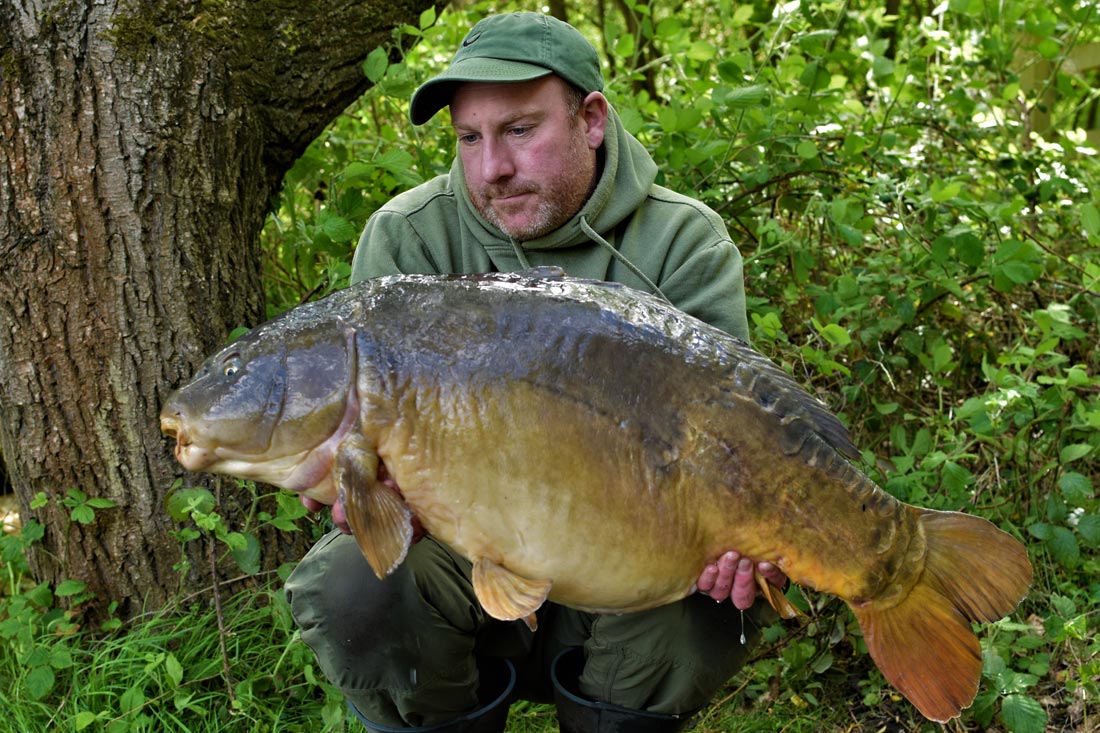 After about an hour a big mirror reappeared to my left, coming right up on to the shallow clean gravel, belly touching the bottom and it’s back almost breaking the surface. It was happily sunning itself, unaware of my presence; then after 5 minutes or so just disappeared back into the murky depths. About 30 minutes later the alarm sounded a take and the rod hooped round on a locked up clutch, and after a typical big fish scrap she went and rolled over the cord first time of asking!
