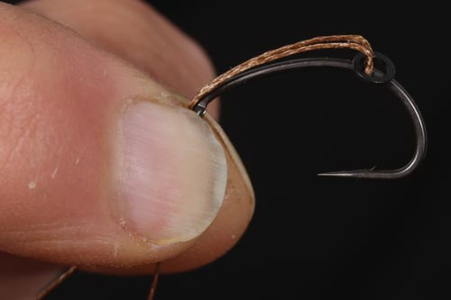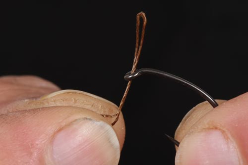 Step 3. Fold the uncoated section back on itself to form a loop and then threat the loop through the eye of a size 6 Covert Dark Mugga hook.