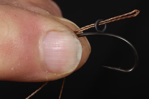 Step 5. Our preferred position of the rig ring is roughly opposite the barb on the hook, or just a few millimetres higher towards the bend of the hook.