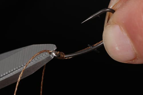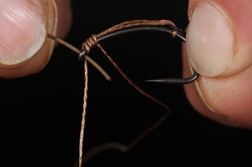 Step 6. Next tie a four turn knotless knot and start whipping the knot in the direction starting on the opposite side to the hook closure. After four turns pass the hooklink through the back of the eye so it exists on the inside of the hook eye and then tighten down the knot.
