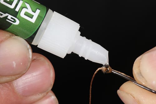 Step 8. To ensure that the knotless knot doesn’t loosen, dab the knot with a tiny amount of Superglue. Be careful not to let any glue dribble onto the slip d or below the eye of the hook onto the hooklink.