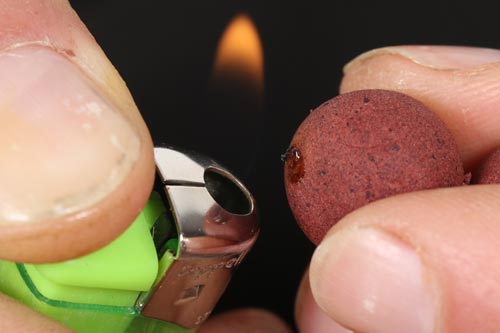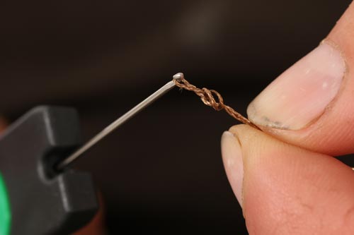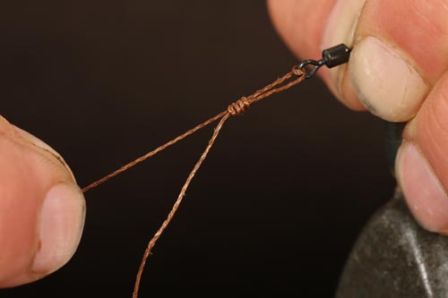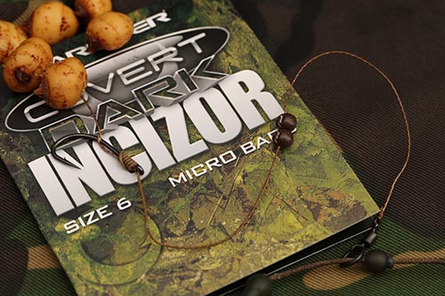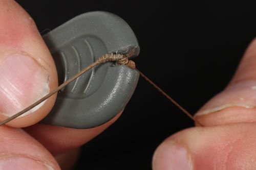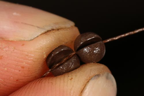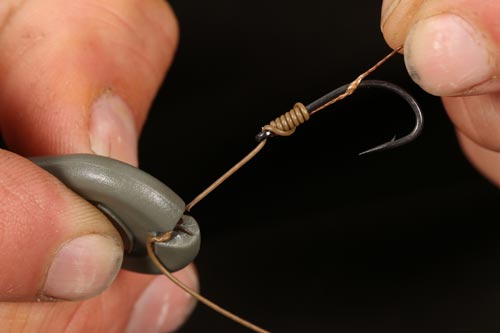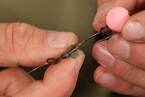 The only other small, yet important detail is the addition of a couple of small shot half way down the hooklink. These enhance the turning action of the hook as the hooklink tightens as the fish picks up the hookbait. Nigel strips the coating off the hooklink leaving just a small section of stiff material near the hook, so it’s not the sort of rig that’s suited to casting out in the lake and he suggests that it is much better suited to being lowered into the edge when setting a trap in stalking situations. It’s also a good rig for using in a solid PVA bag or being dropped from a bait boat out in open water.
