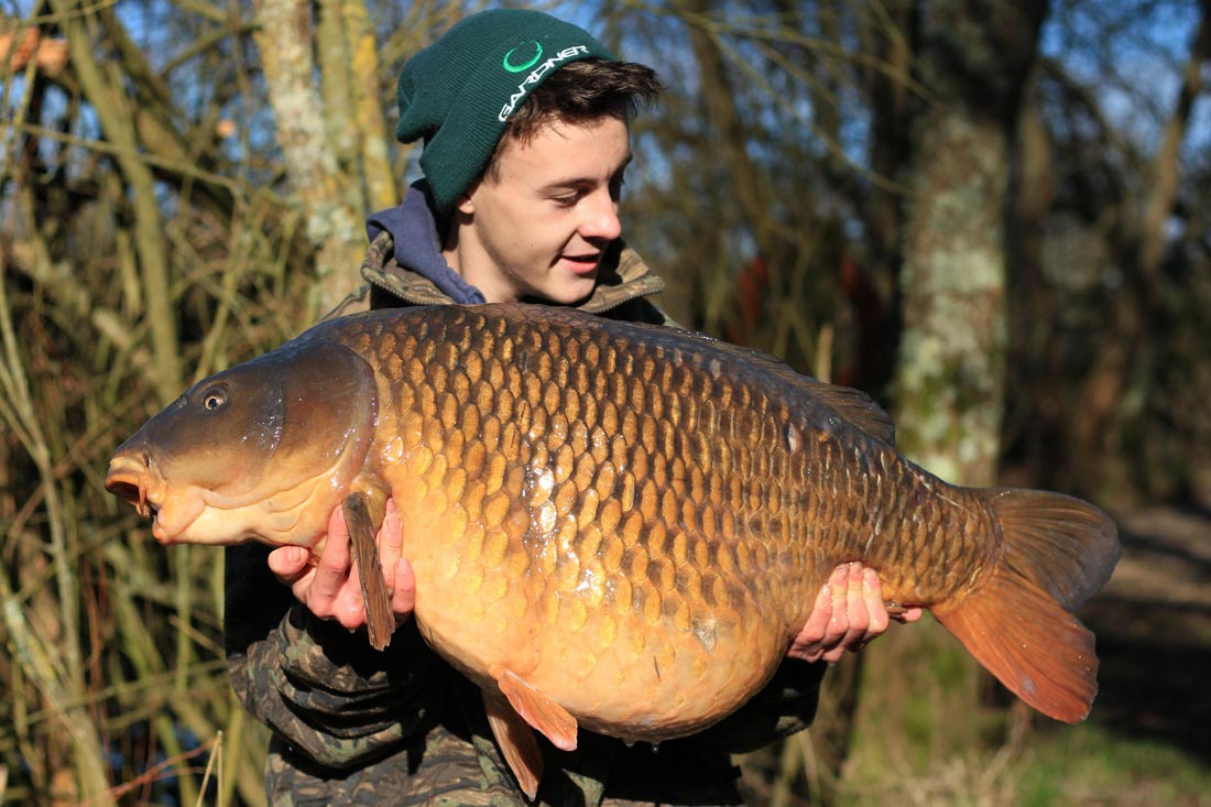 At around 5am my middle rod was away. I quickly got my shoes on and picked up the rod! It charged around stripping line, so I just let it tire itself out. As it came into the margins it tried to reach the snags to my right and take out one of my other lines, but I soon had it under control and I guided it over the waiting net. I could see it was one of the big commons, so I quickly zeroed the sling and scales and got her on the mat to be weighed! She went 40lb 8oz! A new PB common and on a 12 foot zig! I couldn’t believe my eyes, buzzing was by far an understatement.