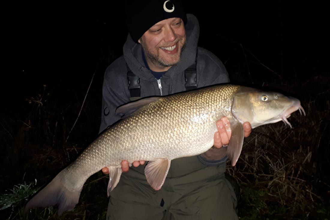 It was whilst drinking the second or third cup of tea, my left rod signalled a typical barbel take. That being fold the rod in half and point the tip somewhere down the river. Fish on! The fight was everything I had remembered about floodwater barbel as it surged from one side of the river to the other. Eventually the pressure I applied gained the upper hand and it was soon wallowing in the net, safe and sound as we readied the mats, sling, scales and camera. It was good to be back.