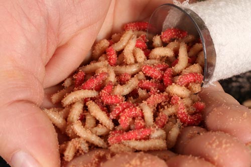 If you’re getting regular action on the rods necessitating recasting you’ll find that the maggots create a build of activity; after all as each carp comes in and sucks up a dirty great mouthful of germs and gets hooked, as the fish panics it will inevitably blow the mouthful of freebies its inhaled out with the hook bait back out, creating a broader baited area and encouraging more carp to come in and feed over the wider spread of maggots. Inevitably a few of these will home in on the concentrated patches where the dissolved PVA bags have exploded their contents over a dinner plate area and the cycle continues.