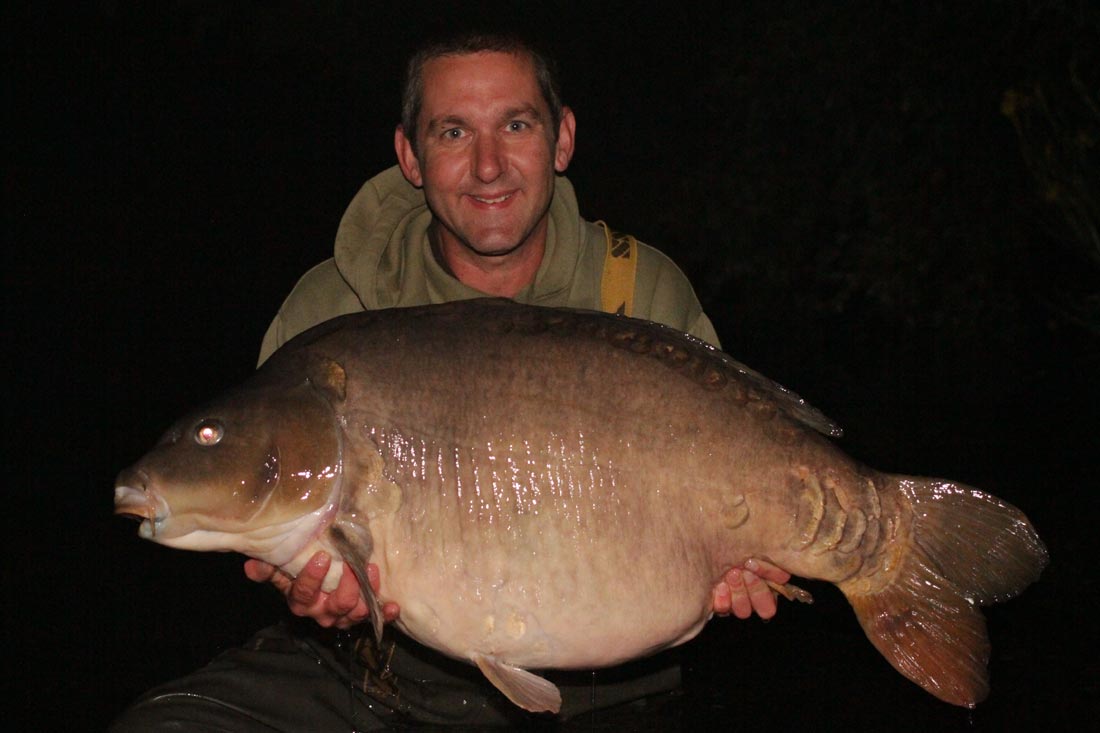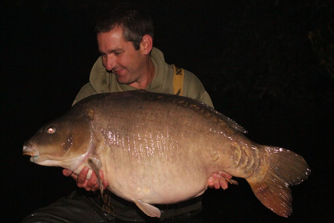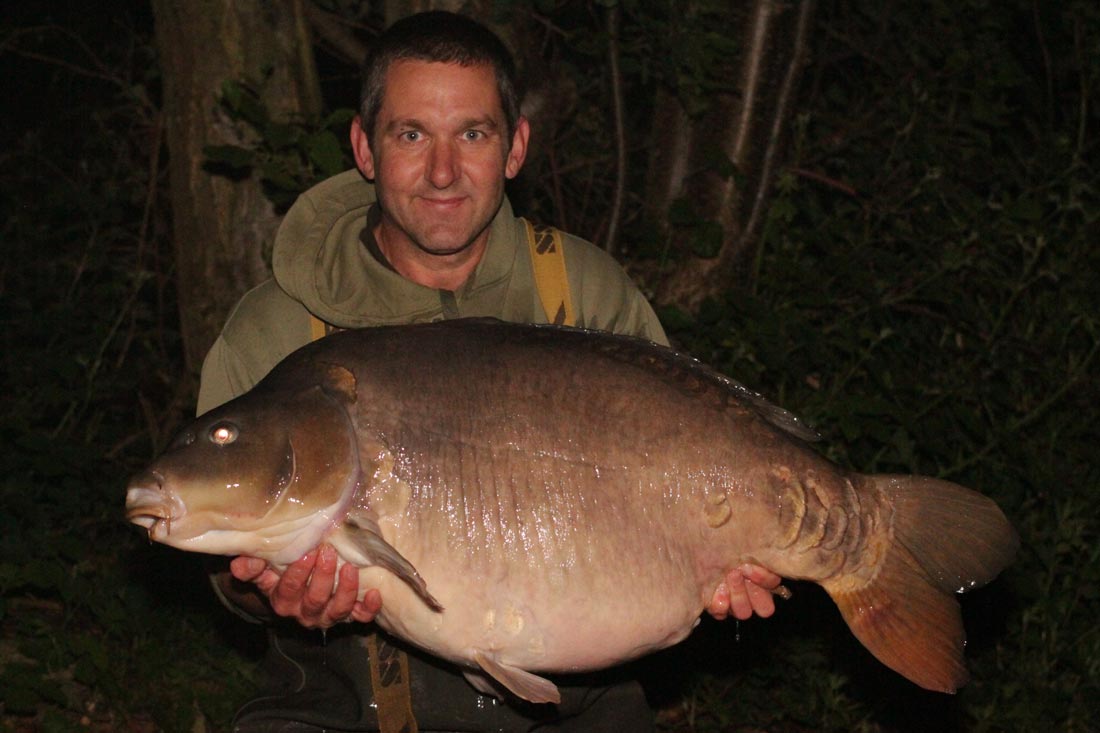 I teased her all the way back on a very slight kite left – all the time bricking it that this could be one of the monsters I hadn’t caught before. When the fish was at the base of the marginal drop off it used its bulk, hugging the bottom of the gully and not allowing me to tease her up for at least 10 minutes of stalemate. Every now and again the rod would give a little jag and I thinking about it am now certain it was the big carps mouth ‘coughing’ violently in and out as it tried to dislodge the hook. No chance!