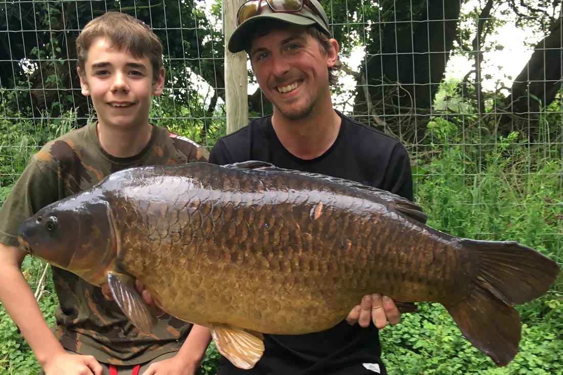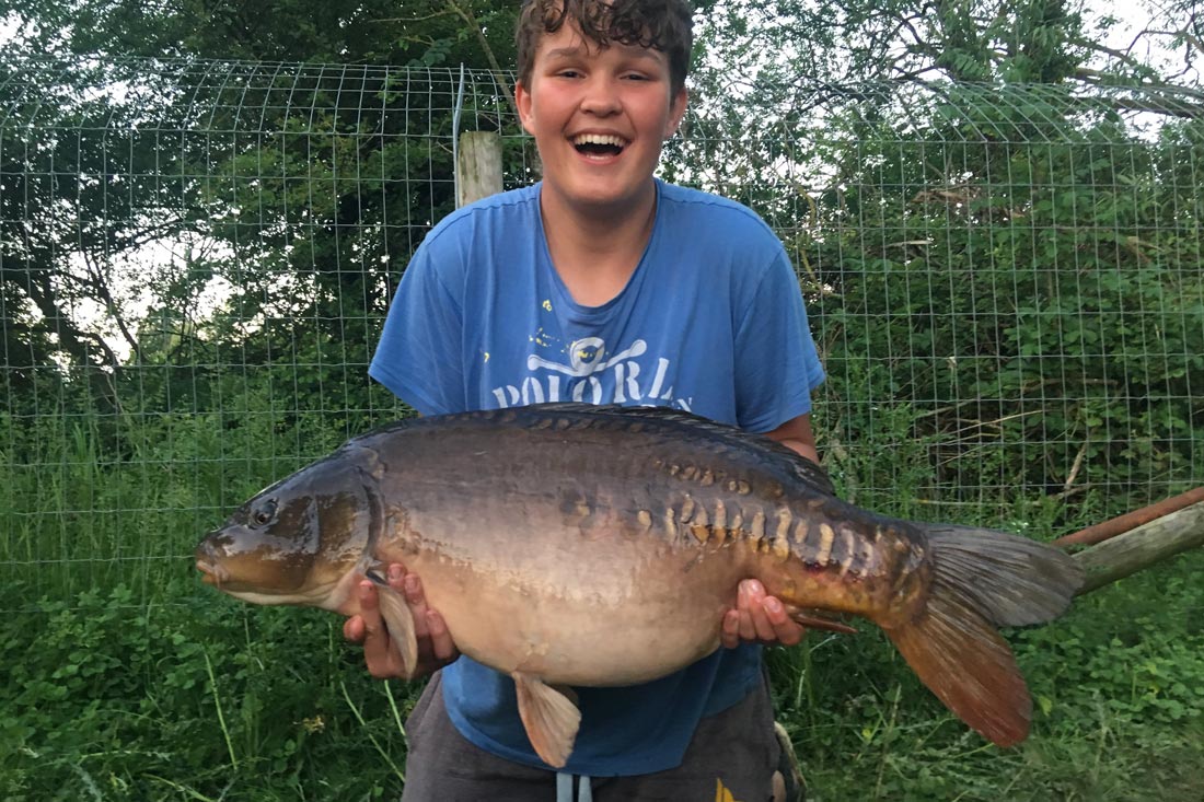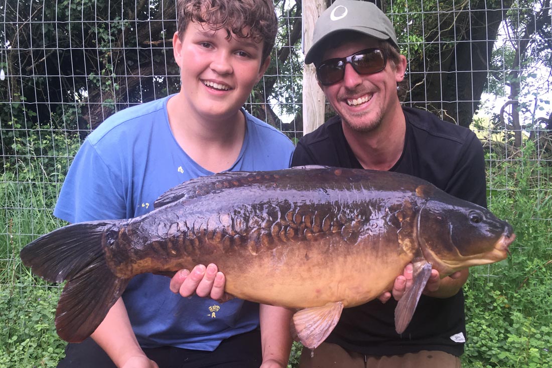 To say we were gutted would be an understatement but I promised the lads there would be another chance with fish still around. We continued to feed for the next ten minutes building the fish’s confidence again before having to make our way around for dinner at the lodge. I told the lads to eat as quick as they could this evening, so we could get back around before the fish moved out again. The lads both scoffed like a pair of troopers and within 20 minutes we were back in the swim firing out some more mixers and again the fish were obliging almost instantly. I left Archie with the floater rod in position and ran down to Lee for some assistance with the feeding, so we could really try and get them going. He was more than happy to help and just as we were about to leave his swim I heard shouts from the lads up the bank as Archie had just landed his first ever carp, off of the surface and completely unassisted! Result! Lee kept the feed going out whilst I went through all of the fish care with the lads and helped weigh and photograph a beautiful 24.08lb linear, what a first carp!