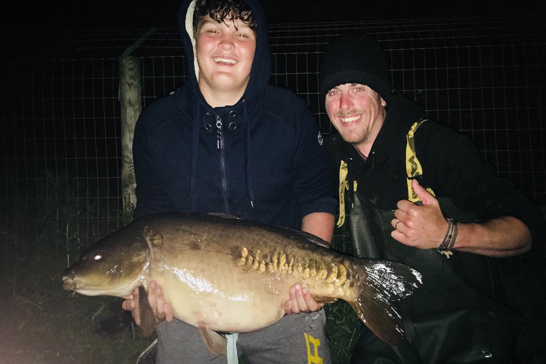 At around midnight just after I had fallen asleep Archie’s right hand rod was once again in meltdown as an angry carp was making a bid for freedom. Archie was up in a flash and stood bleary eyed playing another carp that was charging around with some real purpose. It was no surprise when up popped another chunk of a mirror which turned out to be 30.10lb! Archie had now caught more 30lb+ carp than he had any other weight!! Lee helped with some night shots after we dragged him from his sleep and the rod went back out before we all retired for the night. I awoke at first light the next morning and nothing more had happened although fish were still present, so we sticked out some more boilies over the spot in case all the bait had been cleaned out. It seemed though that the fish were gradually moving out as they were showing more to our right and in front of Lee as the morning wore on.
