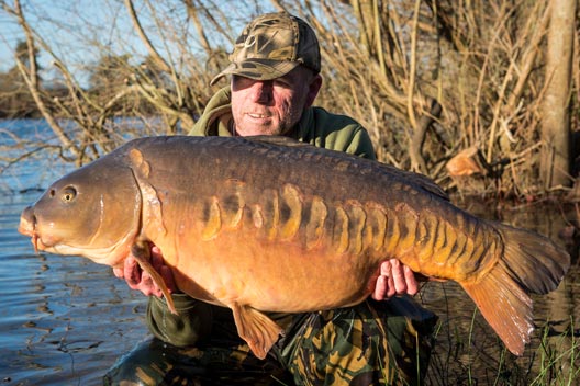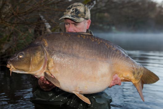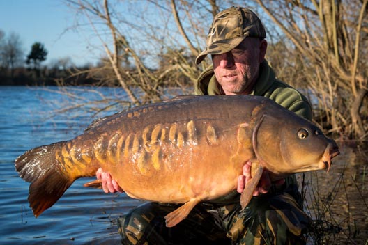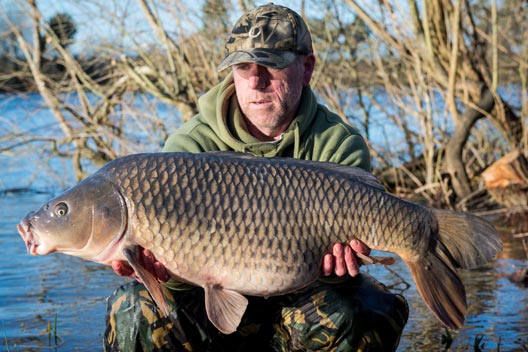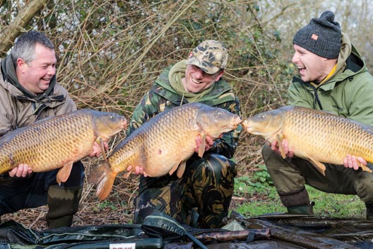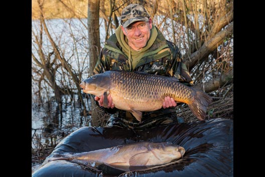 Nothing happened during the night, but just before first light I had my first fish from the lake, a nice dark common of 27lb. With the light levels still a bit low, we decided to keep it in a retainer and have a brew. Just as I lifted the retainer out to do some pictures the recast rod was away again, resulting in a 19lb mirror and a winter brace, result! After we finished the photos, I topped the spot up with a few more spods of bait and within an hour the same rod was away again. As I bundled that one into the net the other rod ticked off and it looked like another brace was on the cards. Both fish went into the retainers and I recast both rods and topped up with some more bait. As I was spodding some more bait out one of the rods ripped off and I soon had another one in the net. An absolutely mental morning and we managed some great shots with us all holding up a fish for the cameras.