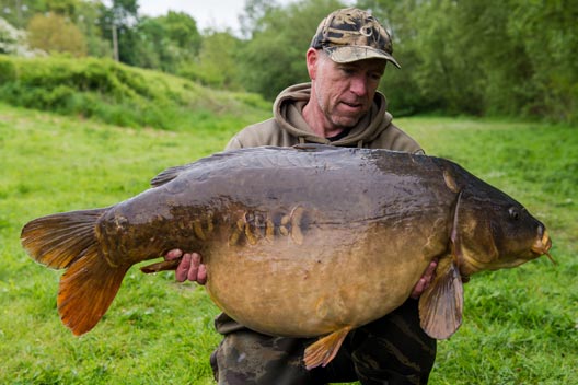 Once back at home I was keen to get back to the new lake and get things going. The biggest challenge was getting a swim, so most trips were spent dropping in for a night in whatever was left, which was a massive change from the nice quiet syndicate I was used to. I managed to find a swim one Friday evening that actually had a few fish showing and it looked like it could be my first chance. I only had the night and through to lunchtime on the Saturday and it was by far the most active I had seen the fish, with fish crashing out all through the night and still showing in the morning. I was fishing two rods close together on a nice clear spot next to a large weed bed and I had a savage liner on my left hand rod that had me running down to the rods. As I stood willing it to move again, the right had bobbin slowly pulled up and pinged out the clip and as it did a large fished boiled on the surface above my spot. I picked up the rod and began to slowly coax the fish back trying to steer it away from the weed and not shake off what was clearly a very large fish. It all went well and I soon had it in the shallow margin, wallowing on the surface prompting me to jump in and slide it into the net. What a start! My first fish from the venue and it was a new pb of 52lb. I was totally blown away! I remember the size 4 hook looking tiny in the fish’s mouth, but it was truly nailed and never coming out.
