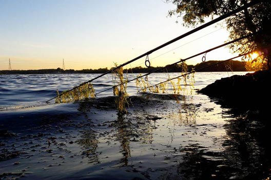 The spot was very snaggy and obviously unfished, as the swim in question was almost completely overgrown and inaccessible. The area directly in front of it had about 5ft of dense weed in around 8ft of water. After all the baiting, and once I finally came to fish it, I had to cut out a swim to be able to even set the rods up. That wasn’t much fun in the searing heat, but needs must. Once I had cleared a small area, I then set about getting the rods out. Due to the proliferation of weed I elected to fish a bunch of worms on a Dyson rig, about 15 inches under the surface on one rod, and a small section of mackerel on a similar rig on the other.