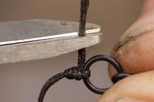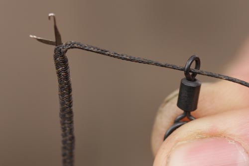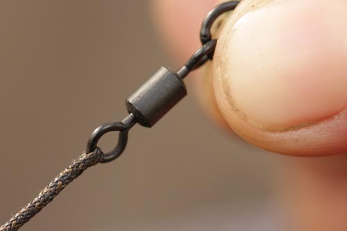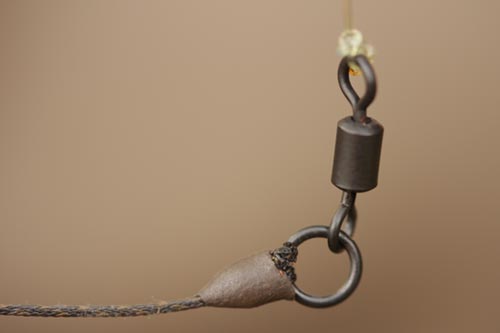 Step 2. Make a boom with Camflex Leadfree by splicing on a Covert size 8 Flexi Ring Swivel. The spliced end should sit by the lead.