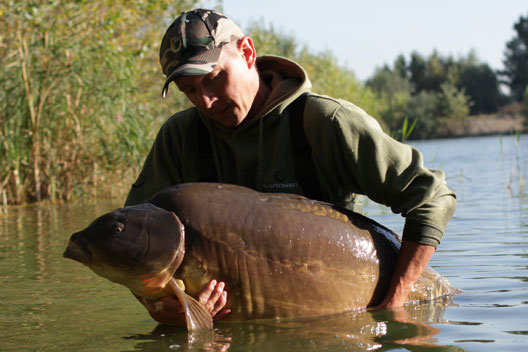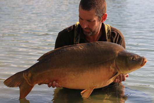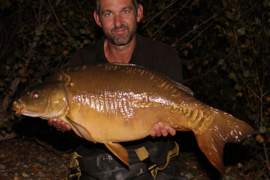 Obviously, as soon as I netted the fish I was playing I laid the net in the water, put the rod down and rushed to help him with his fish. There it was! An immense, lovely looking long mirror with a beautiful over-slung mouth and huge tail, that literally filled the unhooking mat and then some. When the bailiffs arrived and sorted it all out with Peter, I nipped back to my swim to find the top 30cm of the landing net visible about 5 meters out in deep water and the fish on the rod sulking somewhere next to it!