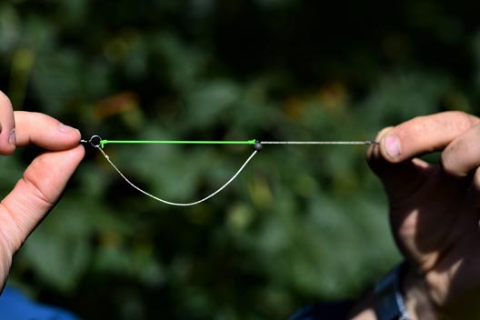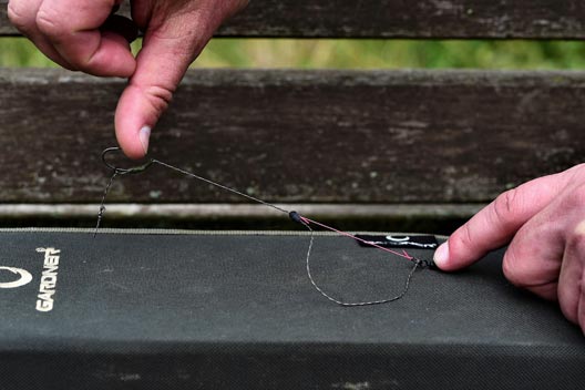 A short length of the elastic was tied to the swivel and the other end was fixed mid-way along the hooklink via an old school float stop. This created a distinct “D” shape in the hooklink. Whilst Andy had been using a degree of elasticity in his rigs for years, to make a hook more difficult to eject, this rig was different in that it created a rig that bit back. Once the hookbait was picked up, the effect was that the hook was actively pulled towards the lead. The photographs will undoubtedly be easier to follow than any narrative. This rig, over the last decade, has been adapted and improved massively, but on the day in question I was happy with how it looked and could not wait to put it to the test.