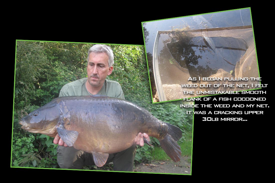 I put the rods back out that afternoon, using my ultimate in stealth step up of Mirage fluorocarbon line, chod coloured leads and a stiff hinge rig with an extremely sharp Chod hook, that looked invisible bar the B5 pop-up as I tested it in the edge. I can remember how hard the left-hand rod smacked down on the cast, a crack that I felt all the way through the rod as the lead hit bottom. At 6PM that evening the left-hand rod was away, and soon after I was standing there in awe as the big mirror was in my net after a savage battle, and a bite completely out of the blue.