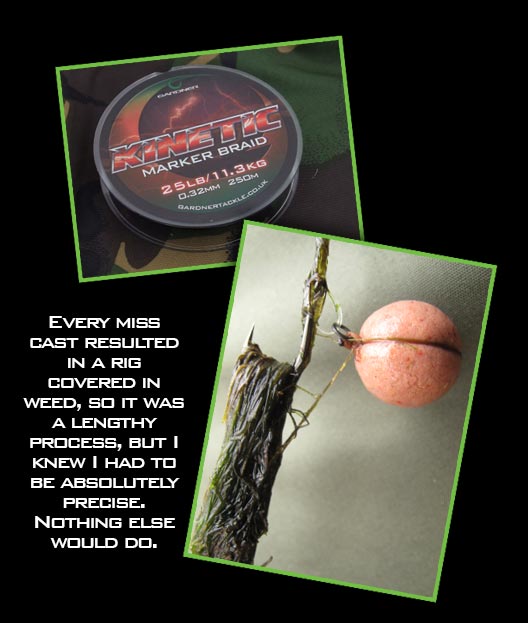 Of the two swims, the furthest end one was my favourite, as I was certain that the spots I had found seemed much better; not too big and blatant, and without too much else in the swim to choose from, hopefully more selective. I focused my baiting on these features and was always careful to avoid the eyes of any other anglers.