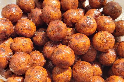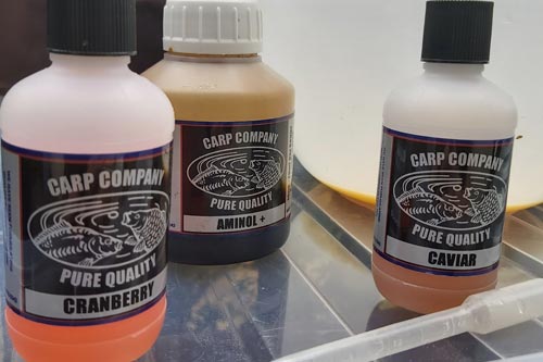 Step 2. At this stage you can add in any chosen liquid flavourings or additives. On this occasion I am rolling ‘match the hatch’ type hookbaits to match the Carp Company Icelandic Red with Caviar & Cranberry freezer baits. I’ve added both flavourings, plus some liquid feeding triggers.