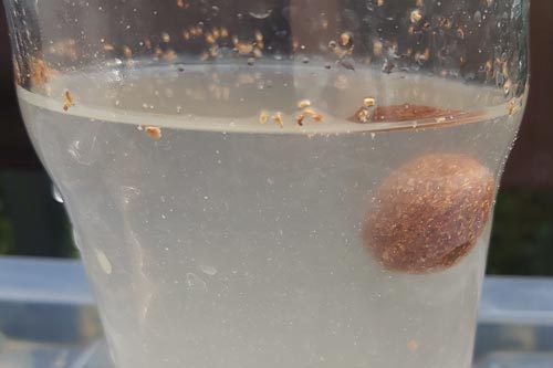 Step 8. At this stage it is time to check and adjust the buoyancy of the mix. Simply fill up a pint glass with water, pinch off a piece of paste and roll between the palms of your hands to form a hook bait of your chosen size. Drop the bait in to the pint glass to see how it reacts. You are looking for the bait to sink to the bottom then slowly float back to the surface, as this should then balance perfectly once on a rig.