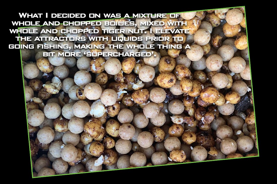 I was not going to come away from using my boilie of choice, ABS Custom Nut, because I have the upmost confidence in it. Instead, I decided to compliment the boilie by including some Tiger nuts too. In fact, I took a bit of advice and pointers off some of the guys from the Gardner Team, which has come in very handy. What I decided on was a mixture of whole and chopped boilies, mixed with whole and chopped tiger nut. I elevate the attractors with liquids prior to going fishing, making the whole thing a bit more ‘supercharged’.