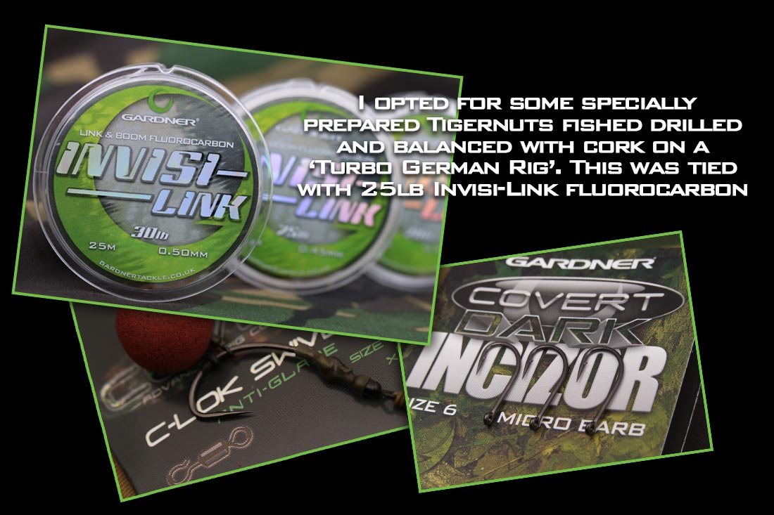 The next step was a slight change in hook bait to try to deter the other species, so I opted for some specially prepared Tigernuts fished drilled and balanced with cork on a ‘Turbo German Rig’. This was tied with 25lb Invisi-Link fluorocarbon to make it rig crude, but not crude.