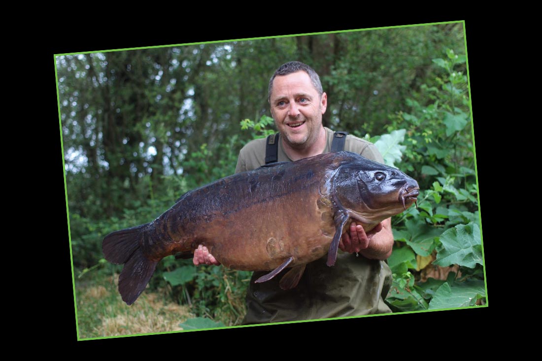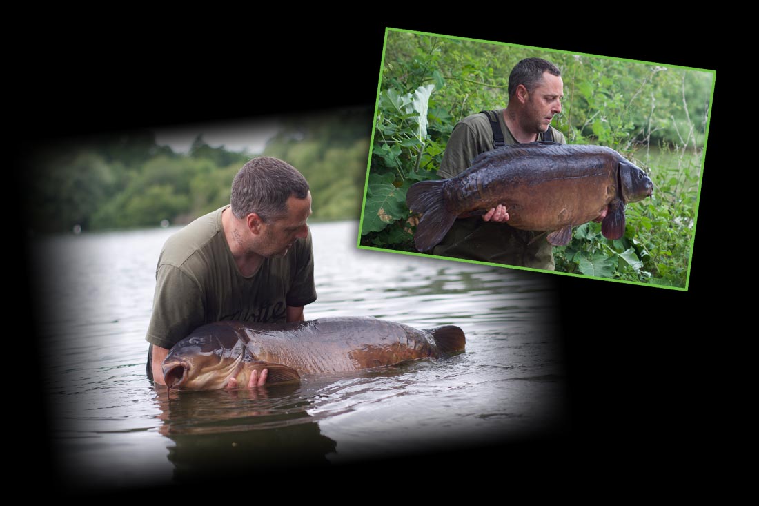 That night the weather had changed I went to sleep thinking it’s perfect conditions, I woke up the next morning and I couldn’t stop pacing thinking “is it going to happen?” I went and had little trot, chatted with Sharpy between swims and the sounder box went into meltdown! I was off and back to the rod, waders on. My mono had become trapped in a storm pole I was using to stop the weed wiping my lines out, a bit of a panic moment as the fish was stripping line all I could think was I need to get as much line back on as quick as possible as the thought of the mono that’s out there being damaged. I didn’t realise Sharpy had been videoing the fight behind me it was that moment as the big black mirror slid over my net this feeling instantly hit me “it’s it” I said. Nige confirmed it after a massive traditional holler “GET UP THERE” the fish was weighed Nige gave the reading of 48lb 2oz and safely put in the retainer whilst the troops gathered. Now I hate a fuss with crowds trying to take pictures so a quick few pictures from them and the Baby Black was returned.