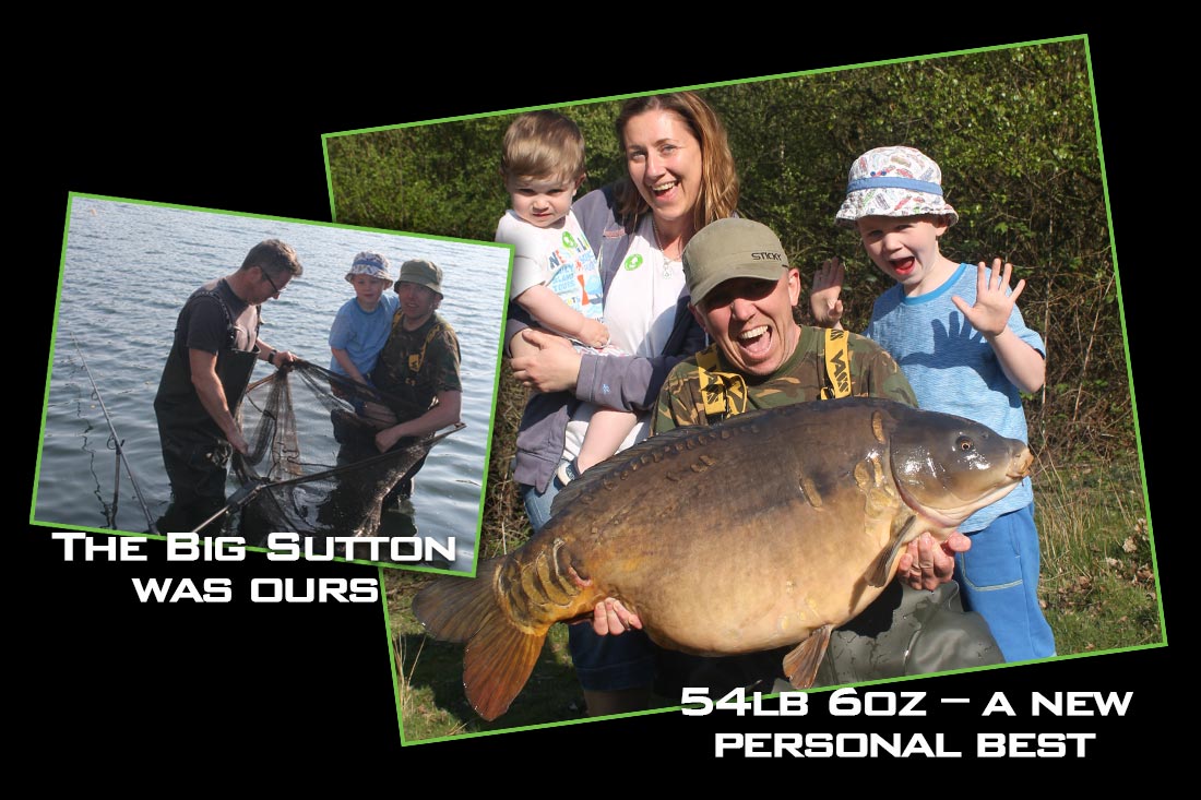 On one spring Saturday in April 2017, Maxine was in the park with the boys and I was in the middle of my inaugural 5-nighter at the lake. On this occasion, I was set up and already doing well in one of my favourite pegs on the lake. My first bite a few days earlier in the shape of the magnificent ‘Small Tail Mirror’ at a jaw-dropping 53lb 6oz. But it was the Saturday that will remain with me forever. After spending an hour with me on the bank, jumping around on my bed chair and eating through all my food provisions. The boys went off to play in the park and I decided to stay behind my rods, because I felt my chances were 50/50 of a daytime bite and they desperately wanted to see Dad catch a big fish. They came back to my peg around 4pm to pretty much say goodbyes. I kissed them all and Maxine was literally about to start the walk back to the car when my faithful left-hand rod let out a one-toner. I lifted into what went on to be another personal best, in the shape of the Big Sutton at a colossal 54lb 6oz. This was one very special, very sought-after carp that didn’t grace the bank frequently, and for my family to witness the whole thing from start to finish made the whole experience ten times better.