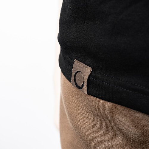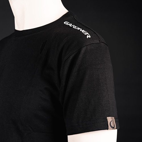 Rounded neck with printed Gardner logo on shoulder, with sleeve and hem tags. Weight 190GSM, 50% cotton 50% polyester.