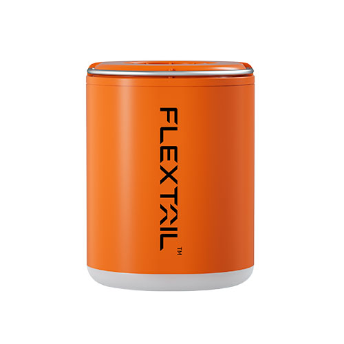 The Tiny Pump 2x is an orange cylindrical device with a white base and lid, displaying "FLEXTAIL" vertically in black on the front. It is shown against a plain white background.
